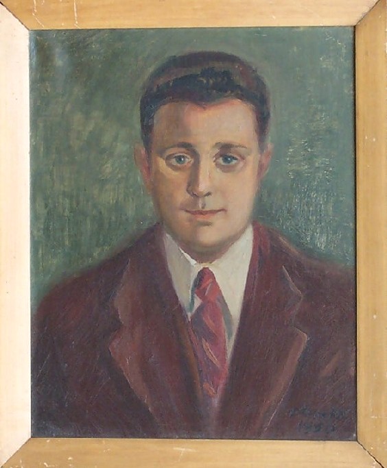 Fairly typical midcentury portrait notable for the exquisite handling of the velvet jacket and the extremely dark palette of the piece. The jacket looks like you can almost feel the softness of the material from anywhere you stand, but the dark tone of the painting gave me fits trying to capture the image on camera. However, I discovered that photographing the piece with natural light outside the house at about 5:30 pm worked perfectly. Overall, a very nice package: Signed, dated, nice frame, good size, and interesting technique.