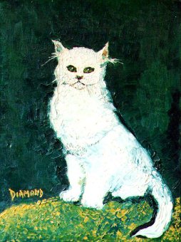 While not my favorite work in the "pet/animal" genre the artist's painterly style is quite interesting. Portions of the foreground resemble many of Van Gogh's later works while the green background has been layered so thickly that the cat appears to glow phosphorescently. Once again it was the painter's signature which initially caught my eye. Is the artist's name "Diamond"? Has the furry feline been monikered "Diamond" because of it's brilliant white coat? Yet another mystery that we may never know the answer to but which will undoubtedly continue to engage art historians in heated discussions for years to come..... .