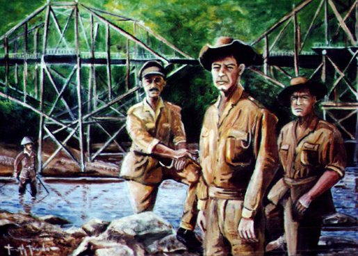 The resemblance between the two figures on the right really is quite striking, but I think it's the "posed" nature of this piece which really knocks me for a loop. This painting reminds me of those old wartime photographs you used to see in Life Magazine, with the soldiers' stoically posing for the camera while bombs explode and tanks roll on in the background. I haven't seen the movie of the same name, but the first words out of anyone's mouth who sees this painting are, "Bridge Over the River Kwai !!! ".