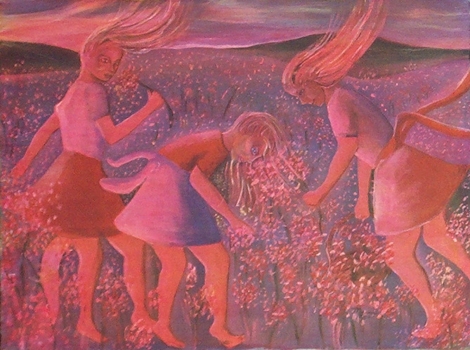 This is another painting that is too frightening to display, and I can literally feel the Satan-inspired energy from the pigment of the paints oozing off of the canvas . I don't know if it's the demonic eyes, the windswept hair, the bare feet, the unearthly pink hue, or the mystery of the action unfolding before us, but this piece is definitely better off tucked far, far away in storage. The gravity defying stance of the three figures, each so intent on the task at hand gives the impression that we are observing a ritual rarely viewed by outsiders ...... In fact, if one were to draw a parallel reference to the celluloid Art form, "The Stepford Wives" or "Invasion of the Body Snatchers" may come to mind.
