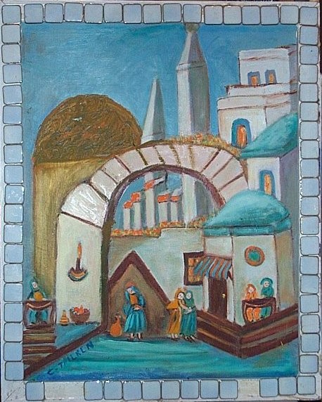 I'm almost certain that the city depicted is Jerusalem, but the figures are the real knockout. I believe the artisan on the left is either weaving cloth or working on some sort of musical instrument, while the couple on the right appears to be waiting patiently for the day's commerce to begin. Of what nature, I'm unsure. In the middle, a couple hand-in-hand and a lone thinker pass through an archway into the foreground of the picture. It looks like the male figures are depicted in blue while the women wear orange, but it's tough to know for sure.