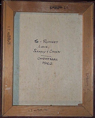 The final painting in my 2001 "Lester Trilogy", this one definitely packs the biggest wallop. As Andy and I were working out the logistics for pickup of the paintings, I heard Andy's wife Amy giggling in the background. After viewing the above painting, her reaction is quite understandable. Who would paint such a thing in 1962? And more importantly, what type of friends must "Sandy & Chuck" be to give this scandalous gift to "Rodney", surely a gentleman undeserving of such a monstrosity of a Holiday gift. It's paintings like this that make my whole endeavor worthwhile ......