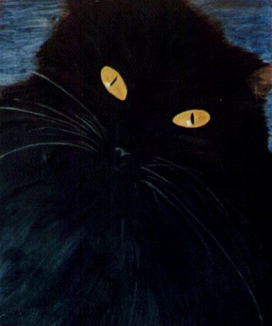 I'm just as much a sucker for cute black cats as the next guy, but why in the world would anyone paint a pet portrait where the poor feline appears to be the size of Godzilla? I urge you to take special note of perspective gone so wrong that the subject's ears do not even fit into the image frame! All this painting really needs to make it complete is a few skyscrapers in the foreground and hordes of screaming city-dwellers running for their lives.....