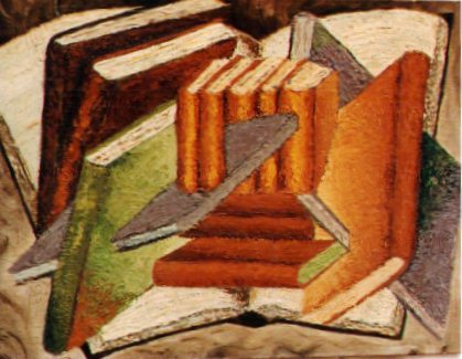 A very cerebral painting as seen by the lofty title inscribed on the back of the canvas. I'm not sure what it all means, but I really do like the way that them thar books look all a tilted back 'n forth, mixed up and such.....