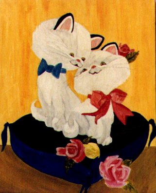 I'm a bit worried that the Cat gods put a curse on me for my mocking delight in this painting. Less than a month after buying the piece, one of my own three cats (the favorite) became severely ill and had to be put to sleep. I hope she's as happy in Kitty Heaven as these two lovebirds are on their little blue pillow. I think this painting is a nice addition, thematically speaking, to the pet paintings featured in Gallery II. RIP Samantha......