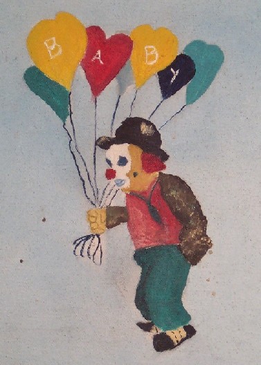 Now normally clown paintings are the kiss of death as far as thrift store art goes, but this one was just way too disturbing to pass up. While Mr. Floating Clown with the Punk Rock 'do is certainly nice, what really gives this painting legs is the horrific masked clown in Adidas lazily parading forward with one hand slung in his pocket and the other holding a handful of balloons picked especially for some lucky bundle of joy ...... Just who needs a cuddly old stork to welcome your kid into the world when Satan Clown is available for a fraction of the price?