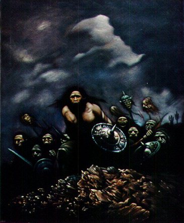 I know, I know, the black velvet thing really isn't my schtick, but THIS one is too good to pass up. This gothic masterpiece was donated to the Galleries by a friend in Florida who acquired it from a co-worker. Apparently, the co-worker's wife gave him an ultimatum - either the painting had to go, or she would. If anyone out there has any ties to Southern Rock greats Molly Hatchet, I bet that this would make a dynamite album cover for a comeback CD. You really can't go wrong with severed heads on poles and leather & metal-clad warriors charging over vanquished enemies.....