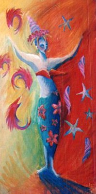 Painted on a 1/4" piece of plywood, this piece is very colorful, very strange, and completely lacking in rhyme or reason. Check out the bizarro pink hat, the arms upraised in prayer and devotion, and best of all, the mutant breasts that hark back to Madonna's "Vogue" period.