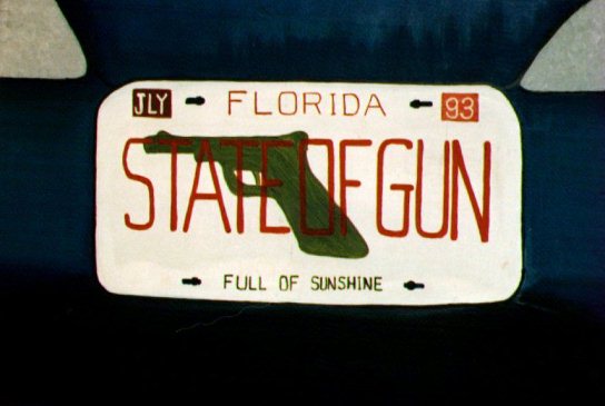 I generally stay away from paintings done within the last 15 years or so but I think this piece is unique enough to make the cut. Although the artist has not been very subtle in his condemnation of the tourist shootings which occured in Florida during the late 1990's, it is uncanny how much the shape of the state of Florida resembles a handgun....