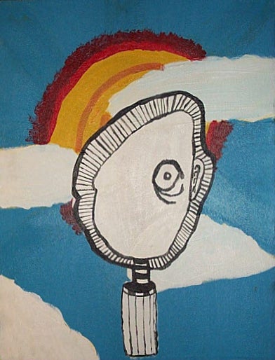 Fast forward once again two years later when I get another e-mail asking me if I still want the painting shown above, which incidentally was REJECTED by the thrift store where Jeff acquired it. The painting was found in an alley outside the thrift store next to the dumpster, ready for disposal. I guess even Salvation Army stores have to have standards. Neither Jeff nor I could figure out which way the painting should hang, and it was unclear if the weird cylindrical white thingy was growing out of the head (we knew it must be a head from the ear), or supporting it from below. However, after living with the piece for a few weeks, I have solved the mystery - the subject of the painting is actually a disembodied head wearing a gas mask.