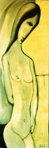 Odd-shaped canvases are always special but this painting has a lot more going for it besides chest-high dimensions. I often wonder if the size and shape of an irregular canvas will dictate the image, or if an artist will buy an irregular canvas to fit the image he wants to paint. The elongated body and face of the central figure remind me of a Modigliani, and I especially like the simplicity of line and the unpredictability of the figure's curves. The woman's torso seems to go on forever. The strange positioning of her arms give this piece a feeling of awkwardness and distance. Unfortunately, my camera was not able to capture the true color of this work and the image appears much lighter than it is in reality. The actual color of this painting reminds me of the dark shade of green that Chrysler might have used back in the late 60's/early 70's for a Plymouth Duster or a Dodge Dart. I'm not usually a big fan of nudes but I think this one is quite special.