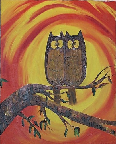 This is one of the few paintings I own which looks better digitally than in person. The orange and yellow sky are much more dramatic when featured in front of a black background, but unfortunately I don't have any black walls in the house. This one cost $7.00, or $3.50 per owl.