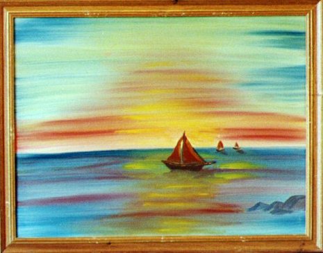 "Three Small Sailboats Pass Beneath Psychedelic Sky"