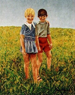 "Pointy-Eared Boy and Girl in Blue Dress Stand in Isolated Field"